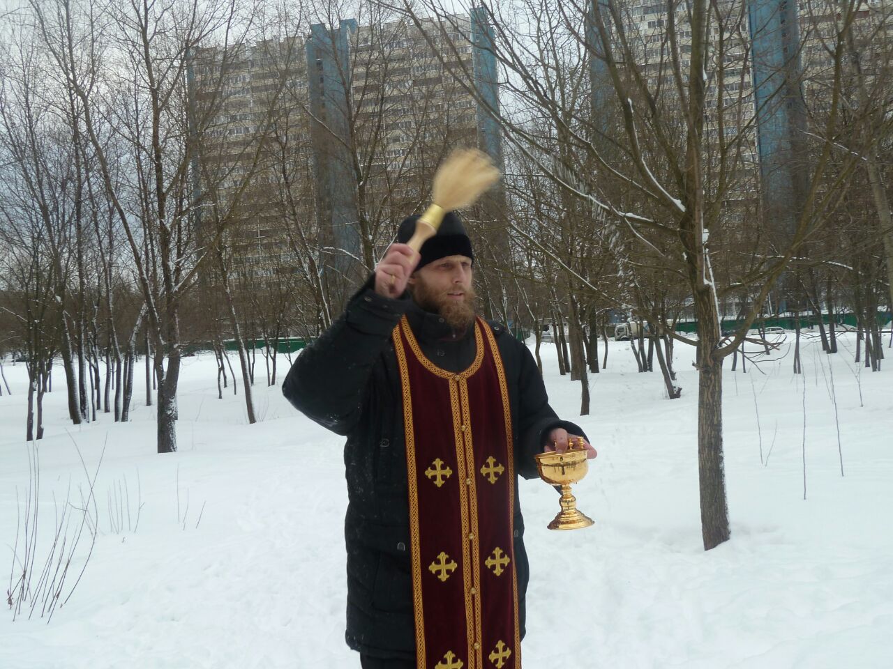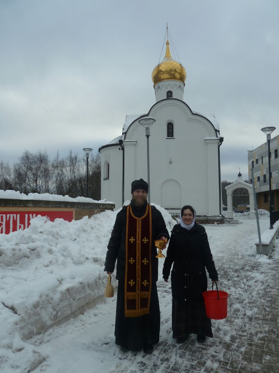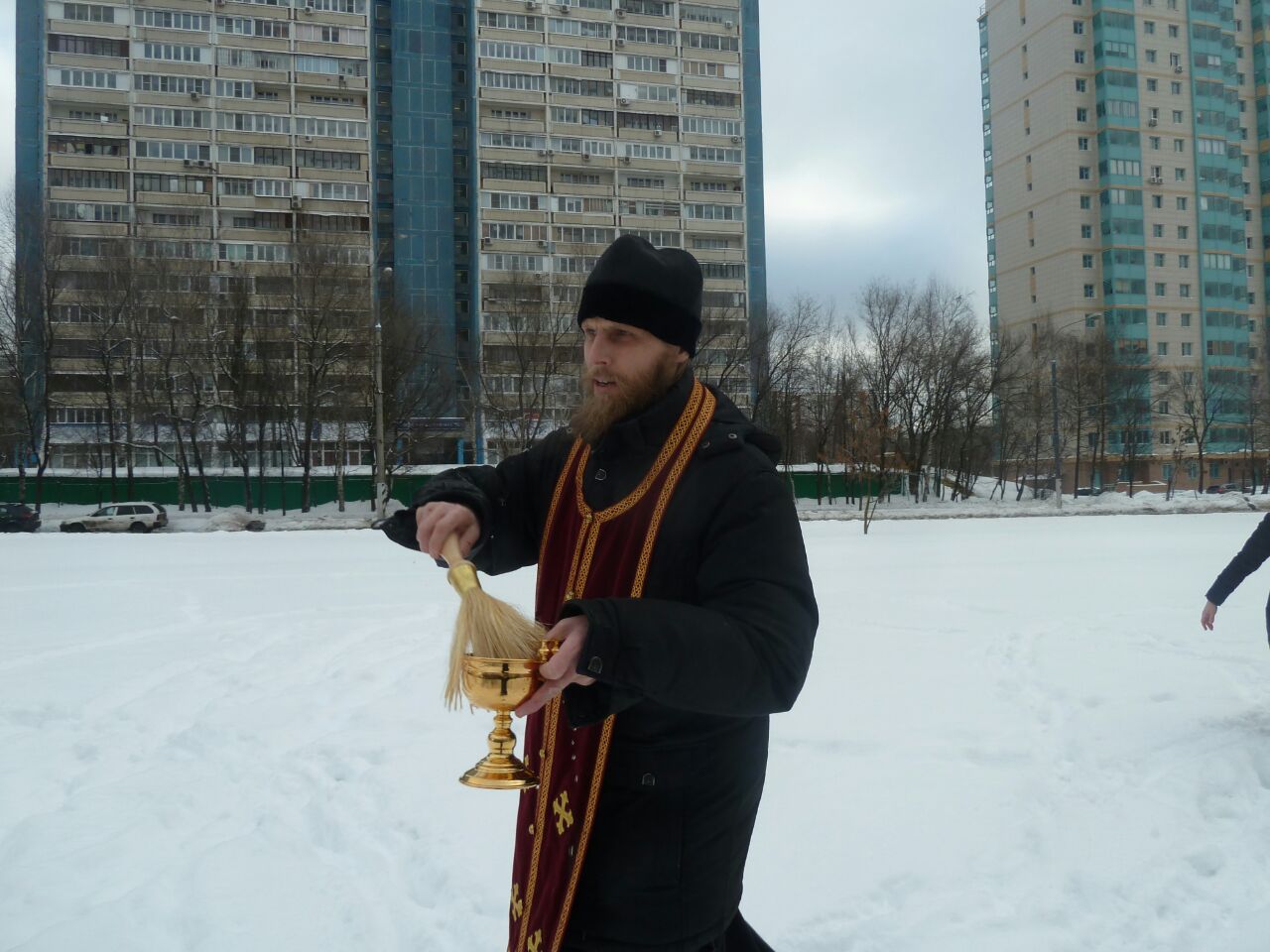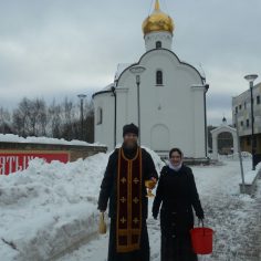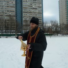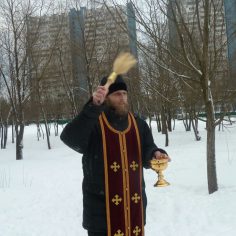 После торжественного освящения и окропления храма и молящихся освящённой водой отец Димитрий, вместе с сотрудниками и прихожанами, окропил крещенской водой место будущего строительства храма Святых Царственных Страстотерпцев в Ясеневе.