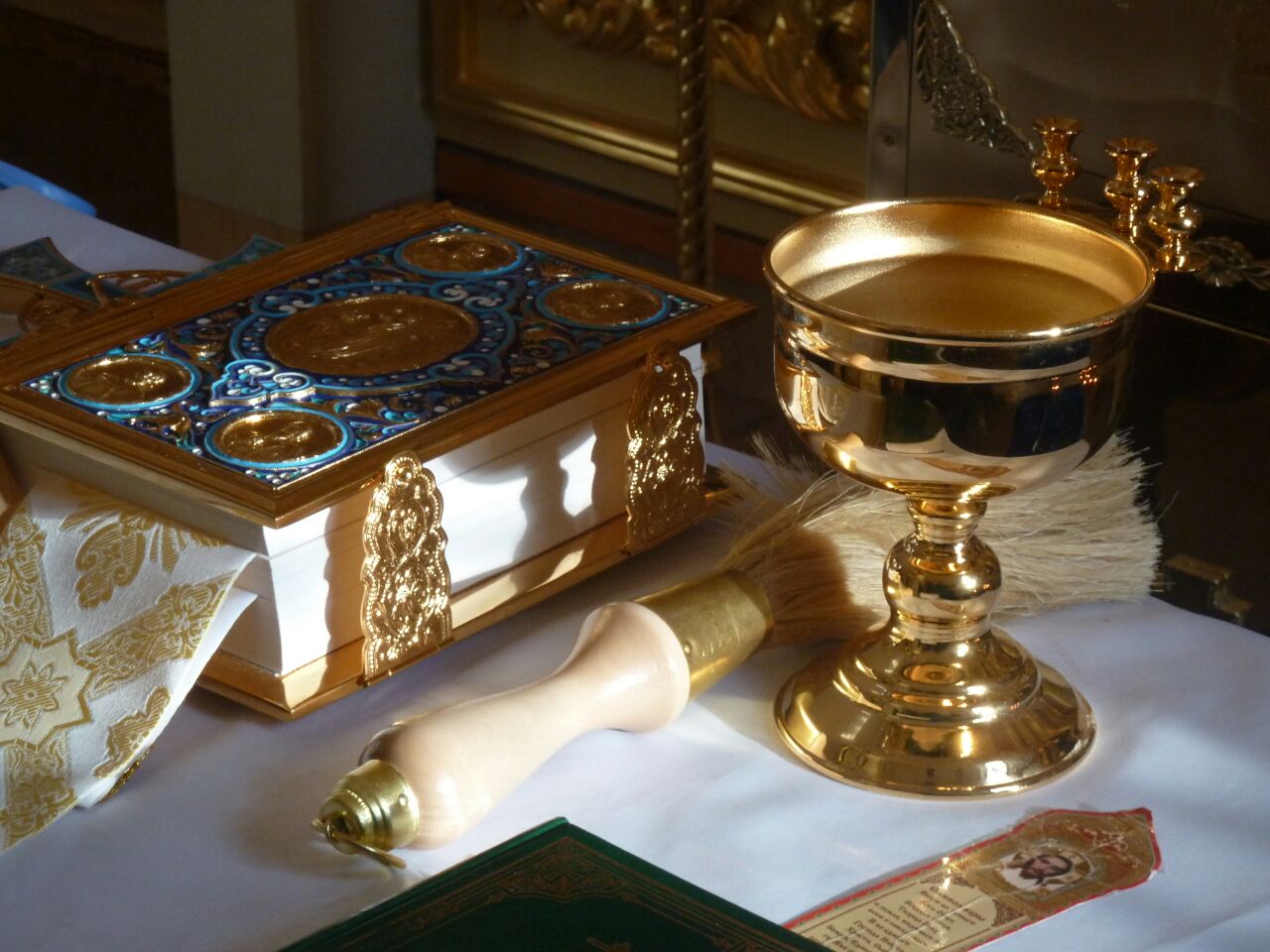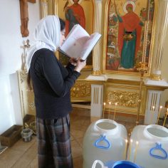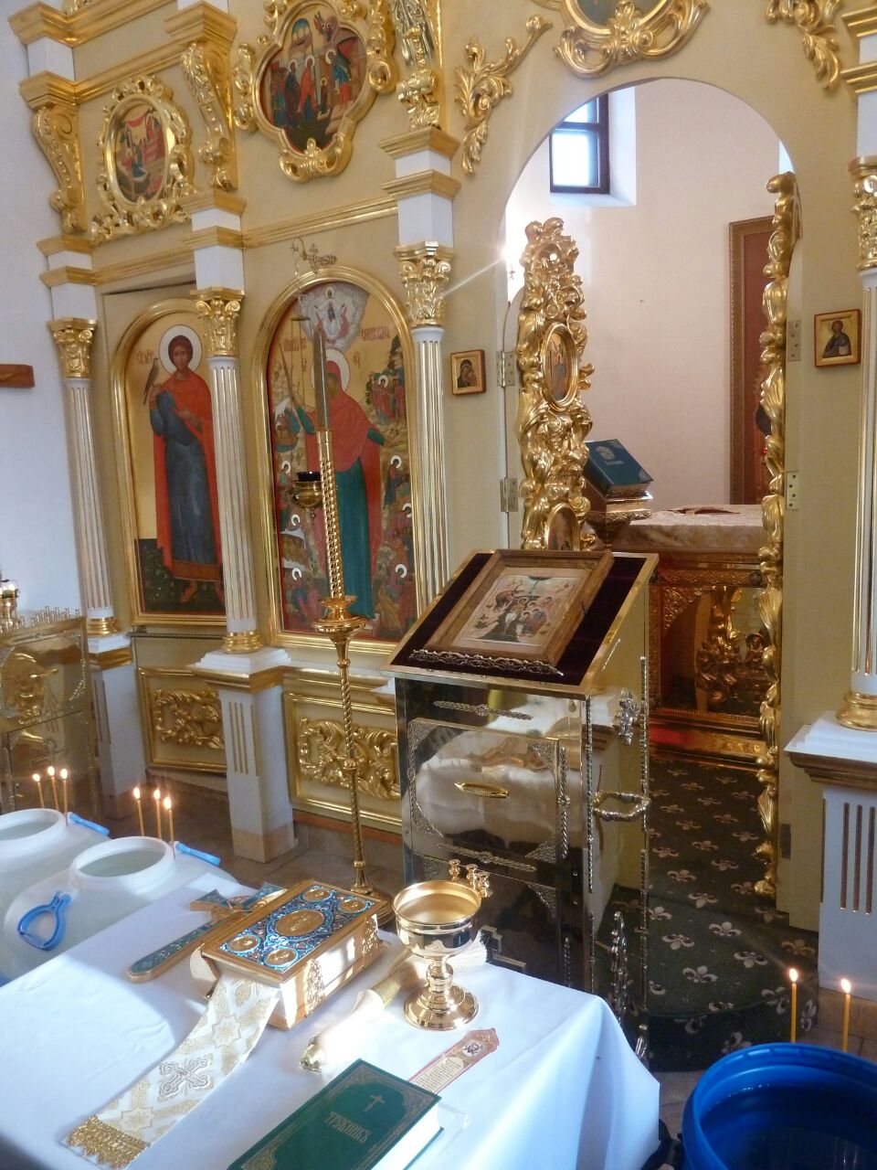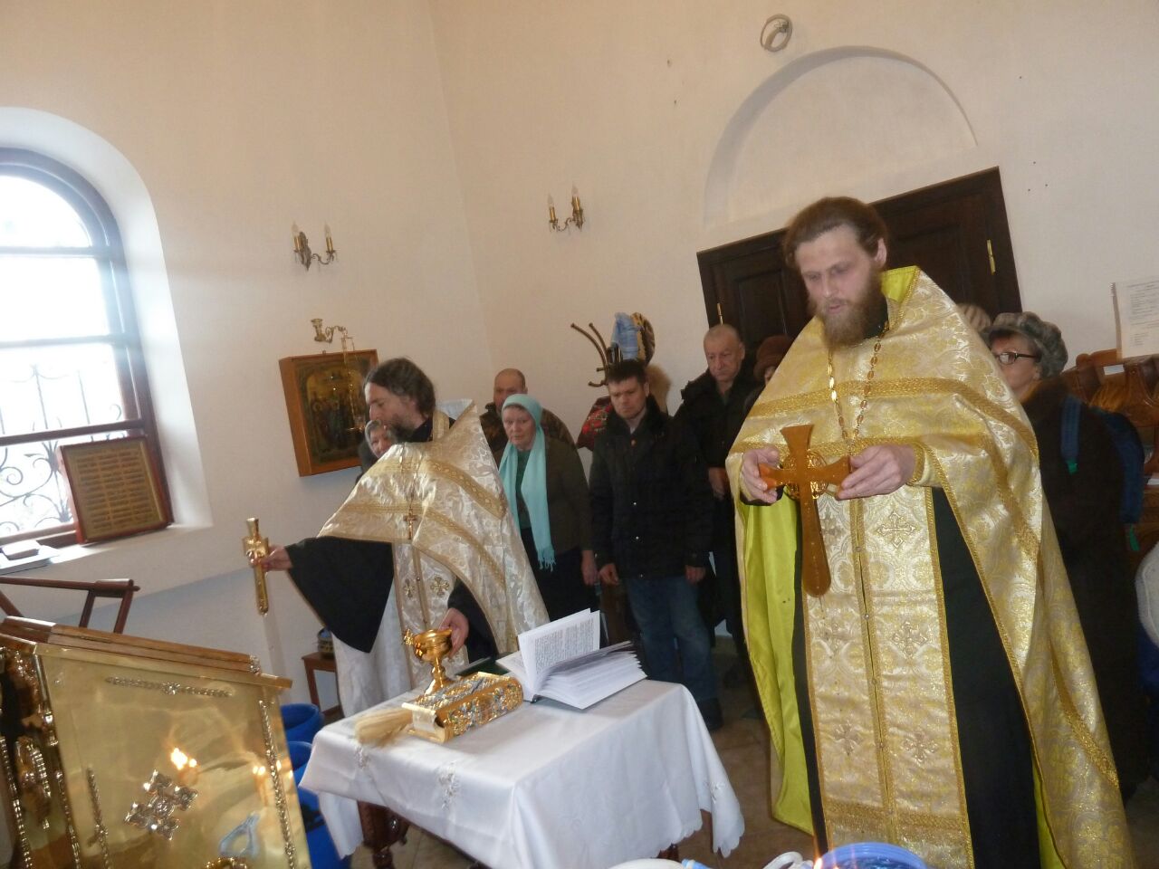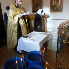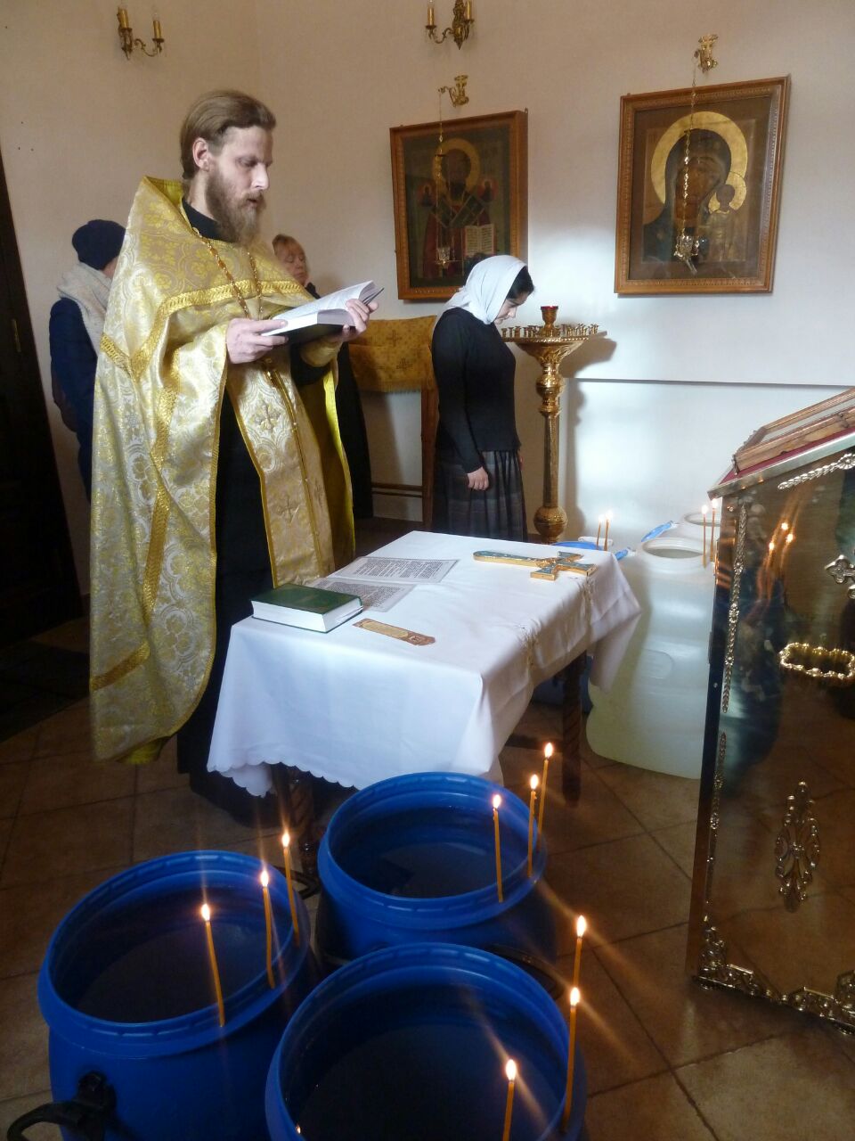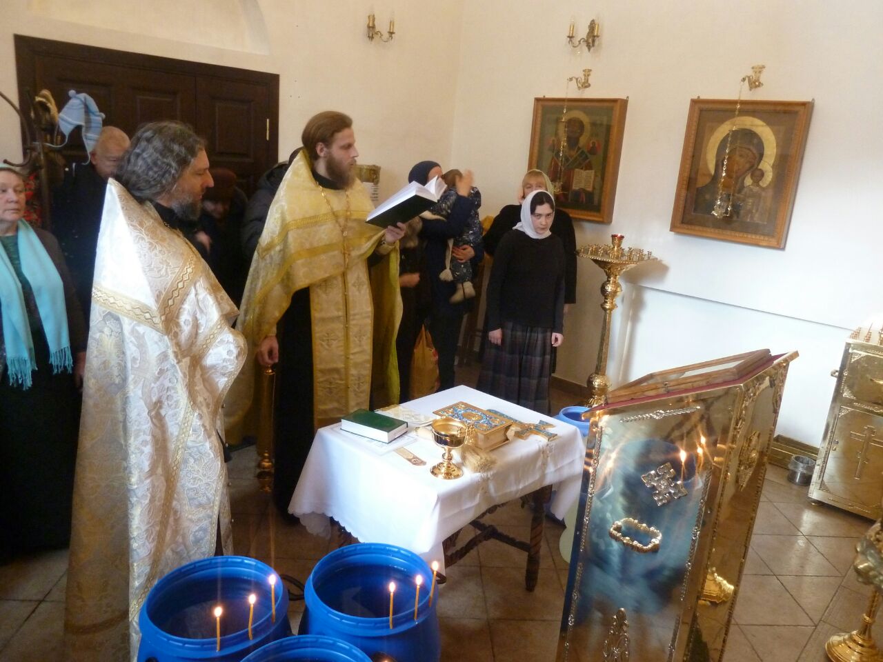 После окропления освящённой водой, духовенство и певчие исполнили тропарь и кондак праздника перед иконой Крещения.