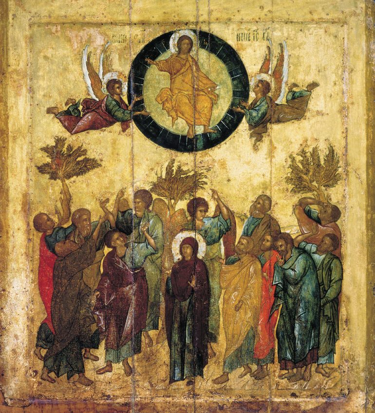 Апостолы благоговейно поклонились благословлявшему их Господу, и с трепетным изумлением смотрели, как Он возносился на небо, пока, наконец, облако скрыло Его от взоров их. Но Господь не замедлил утешить учеников Своих в столь неожиданном и прискорбном для них разлучении. Тотчас явились апостолам два мужа в белых одеждах. Это были Ангелы, которых вознесшийся Спаситель, как Господь и Владыка ангелов, послал на землю к апостолам. Ангелы сказали им: «мужи Галилейские! что вы стоите и смотрите на небо? Сей Иисус, вознесшийся от вас на небо, придет таким же образом, как вы видели Его восходящим на небо.» Услышав от ангелов столь утешительную весть, апостолы, преисполненные глубочайшей радости, оставили Елеон и возвратились в Иерусалим. Столь славно было видимое вознесение Иисуса Христа на небо, о котором повествуют нам Божественные ученики Его, но гораздо славнее было дальнейшее невидимое восхождение Его к Отцу Своему, в вечное Божественное царство, как это и изображается в церковных песно пениях настоящего дня в соответствии с предсказанием ветхозаветных пророков.
