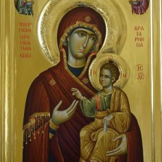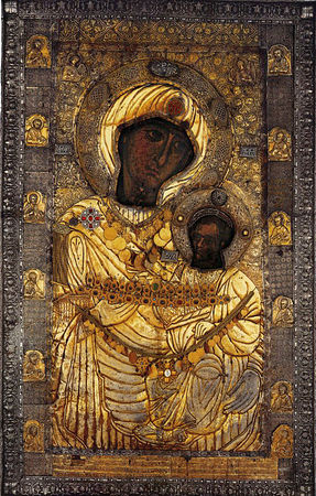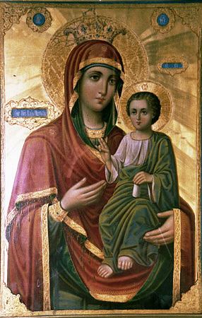 Иверская икона (которая сейчас хранится на Афоне) в IX веке находилась у одной благочестивой вдовы, жившей близ города Никеи. При императоре Феофиле (829–842) иконоборцы, уничтожавшие святые иконы, пришли в дом этой христианки, и один воин копьем ударил по образу Богородицы. Тотчас из пораженного места потекла кровь. Вдова, боясь уничтожения святыни, пообещала императорским воинам деньги и просила их до утра не трогать икону. Когда они ушли, женщина вместе с сыном (впоследствии афонским иноком), для сохранения святой иконы опустила ее в море. Икона, стоя на воде, приплыла к Афону. Афонские иноки, несколько дней видя в море огненный столп, восходящий до неба, пришли к берегу и нашли святой образ, стоящий на воде. После молебна о даровании монастырю явившейся святыни благочестивый инок Иверского монастырясвятой Гавриил Грузин (память 12 июля), по повелению Божией Матери, явившейся ему во сне, пошел по воде, принял святую икону и поставил в храме. Однако на следующий день икона была обретена не в храме, а над воротами обители. Так повторялось несколько раз, пока Пресвятая Дева не открыла святому Гавриилу Свою волю во сне, сказав, что не желает быть хранимой иноками, а хочет быть их Хранительницей. После этого образ был поставлен над монастырскими воротами, где находится и по сей день. Поэтому святая икона называется Портаитиссою, Вратарницею.