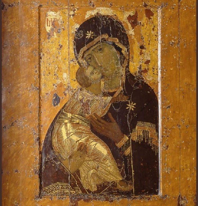 Владимирская икона Божией Матери написана Евангелистом Лукой на доске от стола, за которым трапезовал Спаситель с Пречистой Матерью и праведным Иосифом. Божия Матерь, увидев этот образ, произнесла: «Отныне ублажат Меня все роды. Благодать Рождшегося от Меня и Моя с этой иконой да будет».