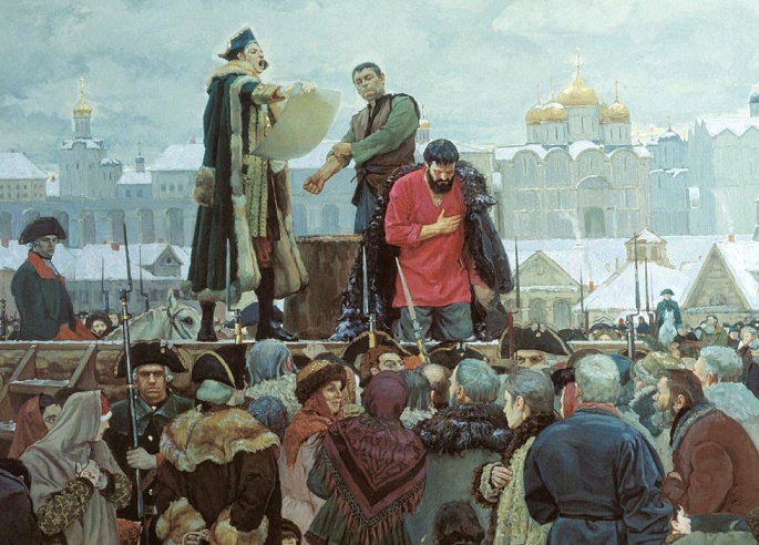 Пугачев Емельян Иванович (1740/или 1742/ – 1775), донской казак, хорунжий, предводитель восстания 1773–1775, ранее участник Семилетней (1756–1763) и русско-турецкой (1768–1774) войн. Под именем «Императора Петра III»; поднял восстание яицких (уральских) казаков в августе 1773 г., которое превратилось в самую крупную «крестьянскую (гражданскую) войну» в истории дореволюционной России. Причиной ее стала внутренняя политика Екатерины II, направленная на расширение вольностей дворянства (оно было освобождено от обязательного несения воинской службы) при усилении закрепощения крестьянства, превращенного в личную собственность дворян.